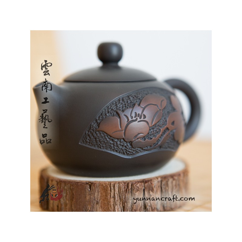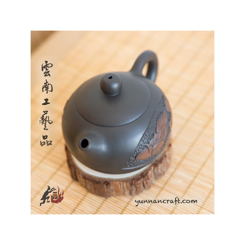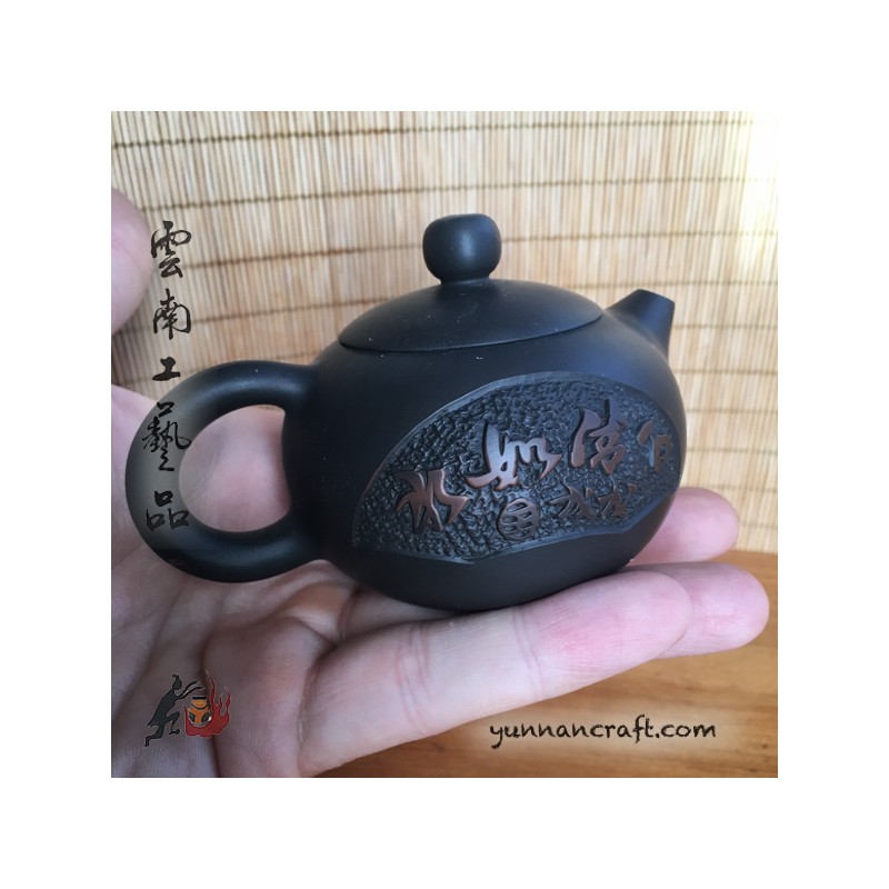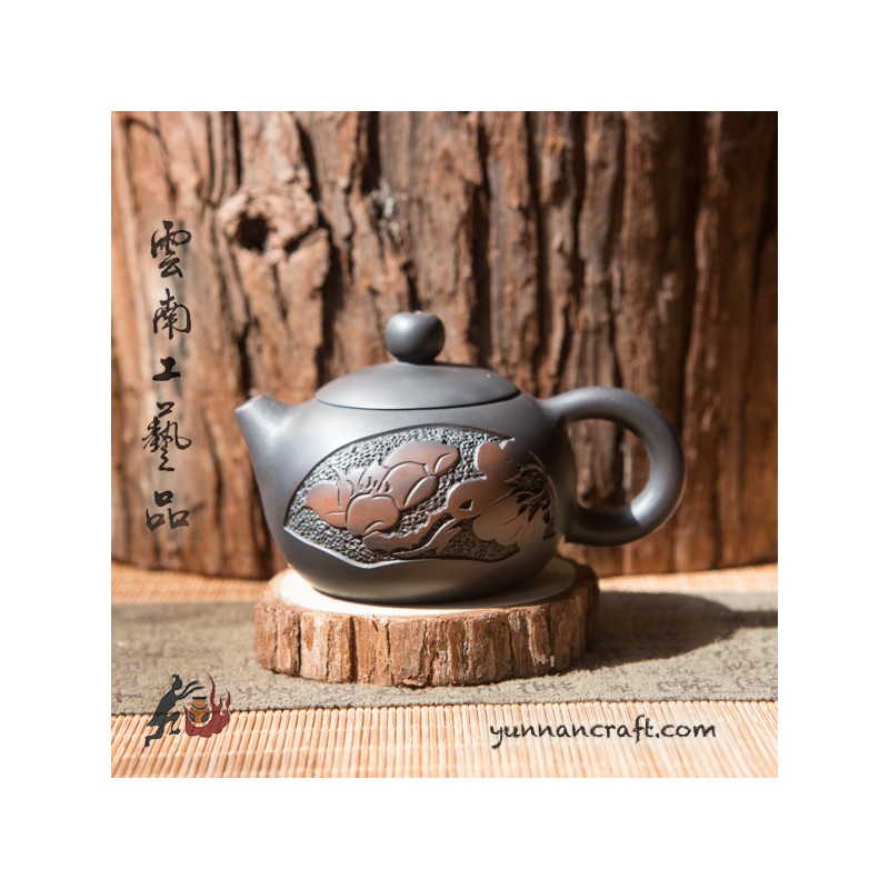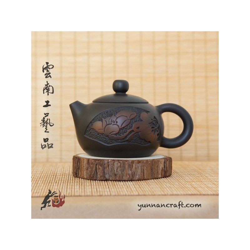 Handmade black-brown small size teapot in Xi Shi style with polished brown features on hand carved flowers of lotus and calligraphy ‘XIN QING RU SHUI’ which means - keep your mind calm. Thick wall teapot suitable for black tea or pu-erh tea.