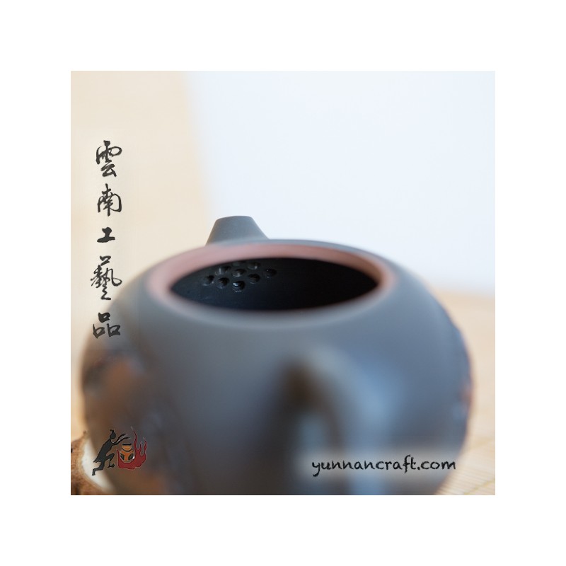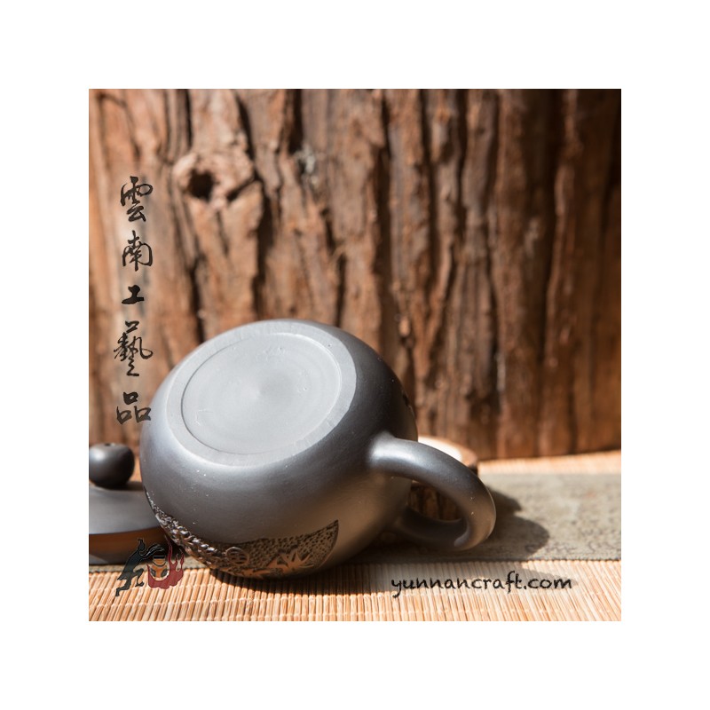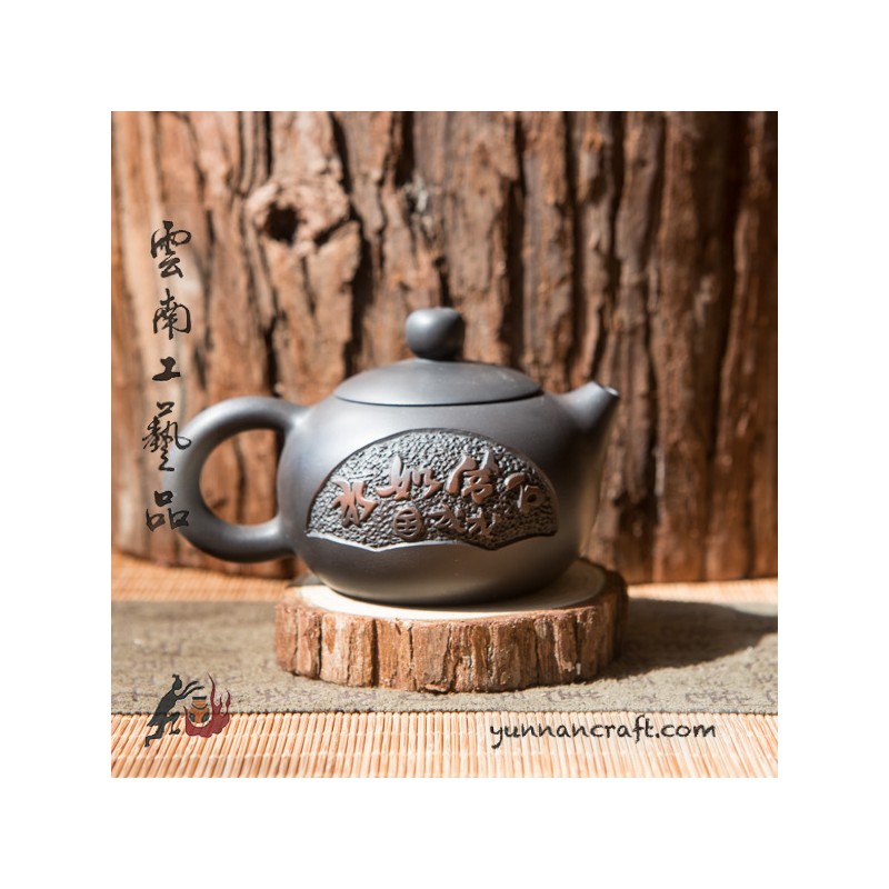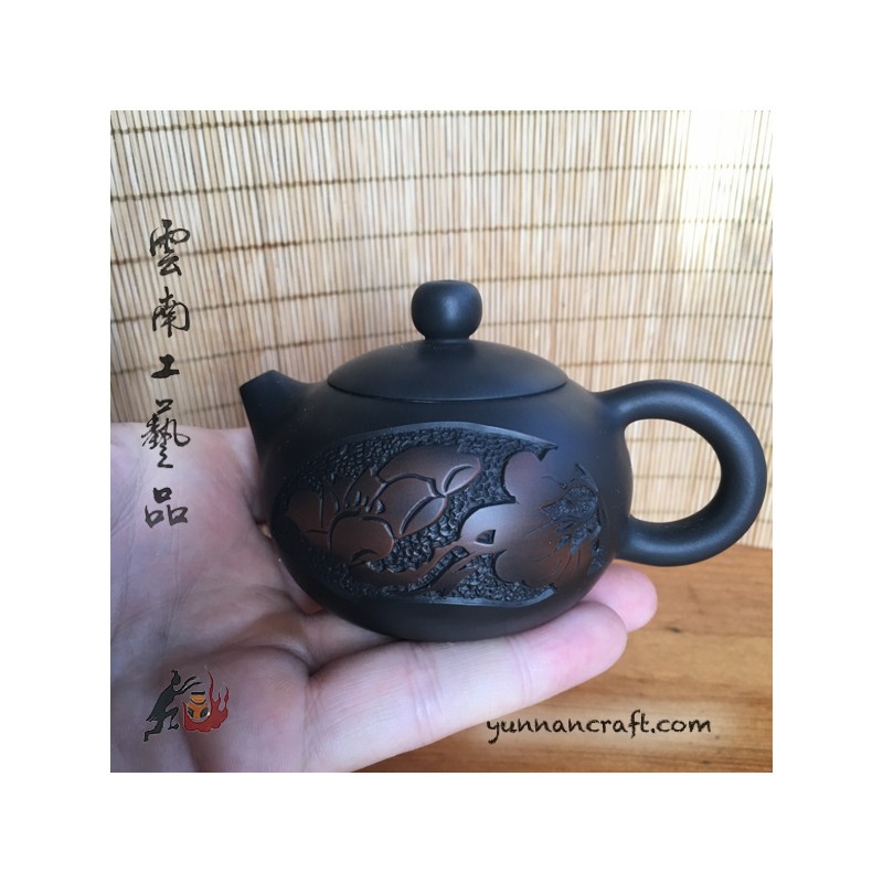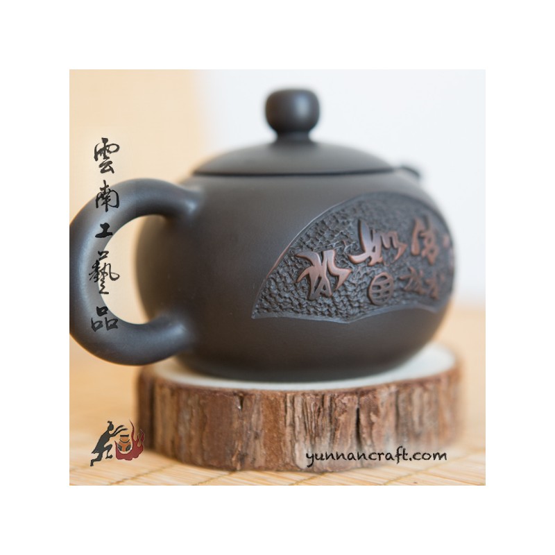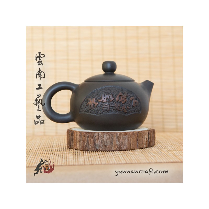 Handmade black-brown small size teapot in Xi Shi style with polished brown features on hand carved flowers of lotus and calligraphy ‘XIN QING RU SHUI’ which means - keep your mind calm. Thick wall teapot suitable for black tea or pu-erh tea.